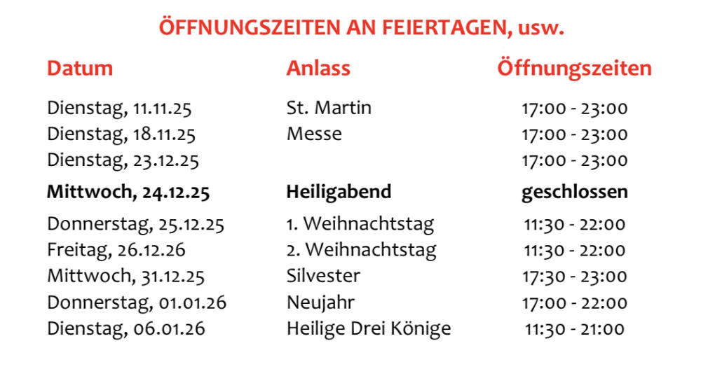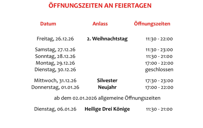 Mittagskarte  Mi bis Fr: 12:00 bis 14:00 Uhr Tageskarte   Mo: 17:00 bis 21:00 Uhr Mi - Do: 11:30 bis 21:00 Uhr Fr + Sa: 11:30 bis 21:30 Uhr Sa + So: 11:30 - 21:00 Uhr Speisekarte  durchgehend